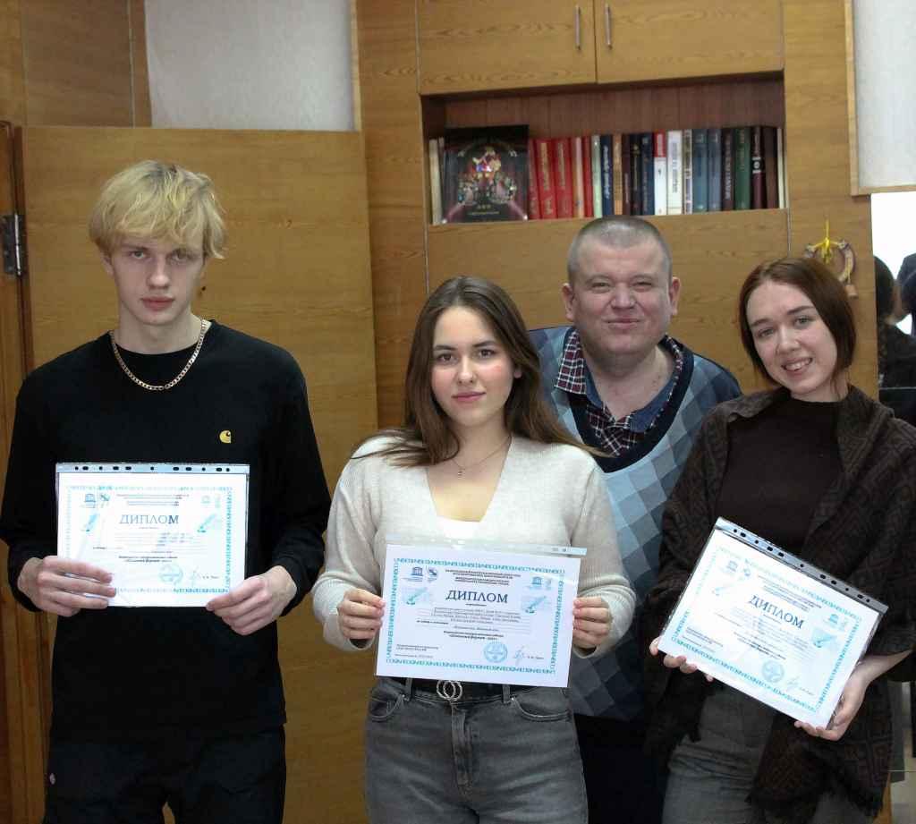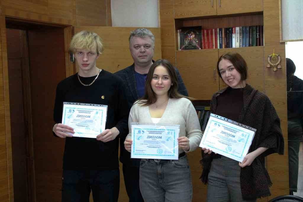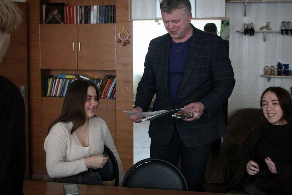 Остальные участники дружного редакционного коллектива Алиса Шаститко, Матвей Сагунов и Алина Дмитриевна Чеберяк появились аккурат в 14-00. «Точность – вежливость королей», как говорилось в одной старинной рекламе начала девяностых. Награждение начинается с неспешного разговора. Впрочем, в кабинете директора – это многолетняя традиция… Так незаметно и до дипломов добрались. Дмитрий Николаевич просит на достигнутом не останавливаться и преумножать успехи. Жмет руку каждому, вручает дипломы и сладкий приз – шоколадку… И традиционное фото на память.