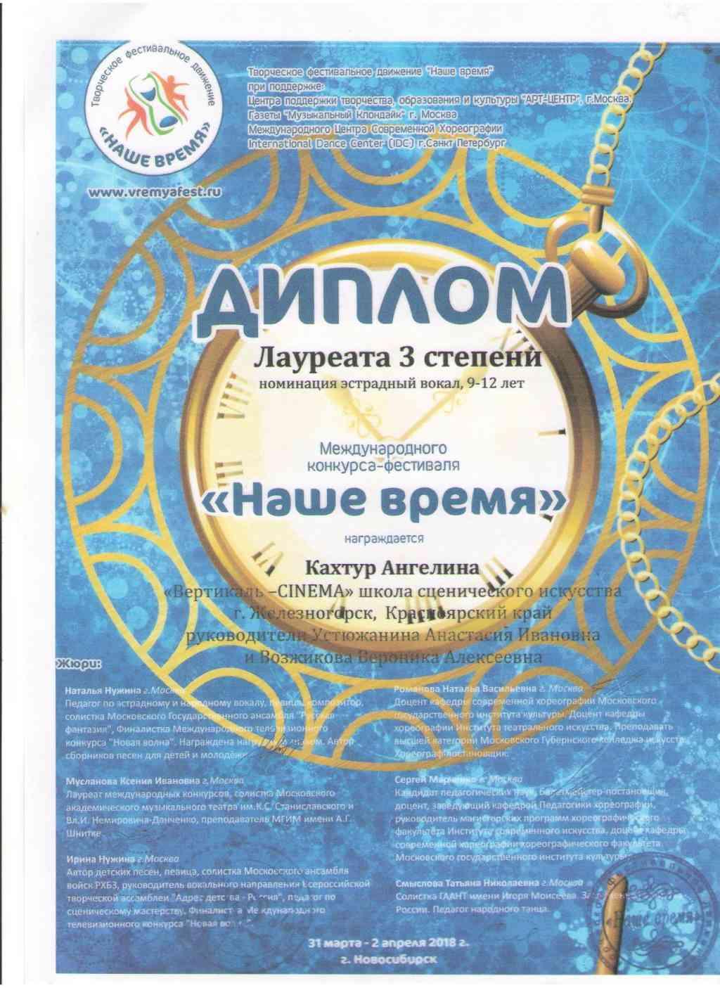 Во-вторых, целеустремленность, талант и высокий уровень вокального искусства Ангелины не могли не заметить в Международном конкурсе-фестивале «Наше время» (31 марта - 2 апреля 2018г.).