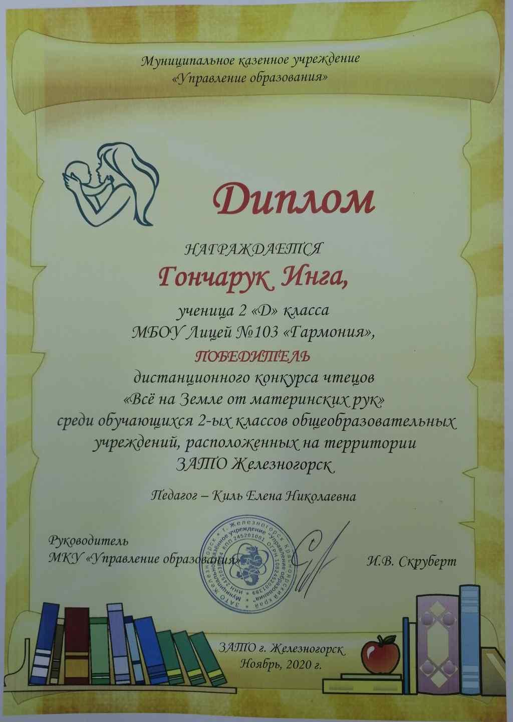 Победителем стала ученица 2 Д класса нашего Лицея Гончарук Инга! Поздравляем с победой Ингу и её классного руководителя Киль Елену Николаевну!